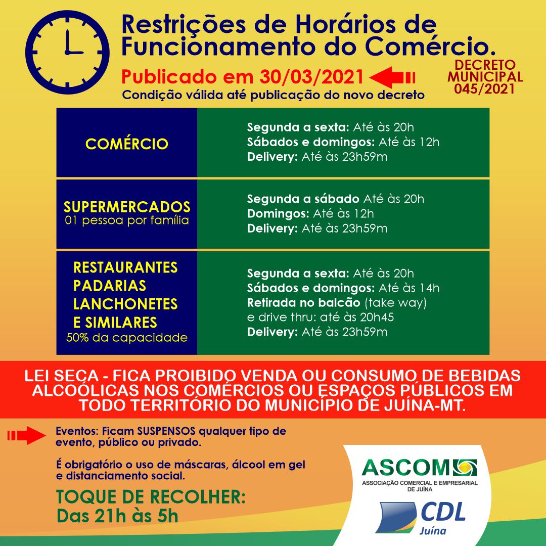 Com a publicação do decreto Municipal 045/2021 de 30 de março de 2021, ficam válidas as seguintes restrições para o comércio de Juína.