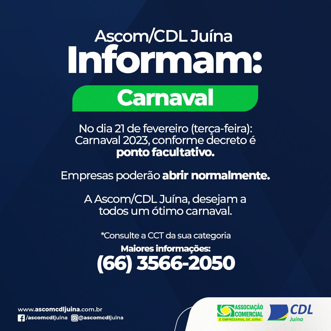 Neste ano o carnaval será celebrado no dia 21 de fevereiro, terça-feira, e mesmo sendo uma das principais festas do país onde tradicionalmente a maioria das empresas optam por dispensar seus colaboradores a ASCOM/CDL Juína esclarecem que não é feriado e o comércio pode convocar o trabalhador normalmente, sem qualquer ônus para a empresa.