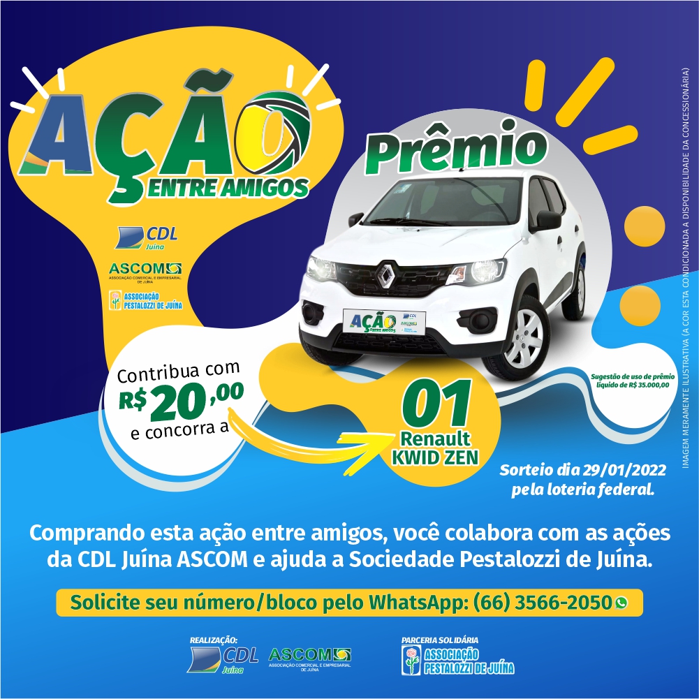 Já pensou em começar 2022 com um carro 0km, ajudando o comércio local através da ASCOM/CDL, a Sociedade Pestalozzi Juína e por uma quantia de apenas R$20,00 (vinte reais)? Então faça parte a Ação entre Amigos ASCOM/CDL Juína e Pestalozzi.