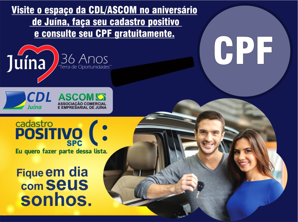 A CDL/ASCOM participará da festa dos 36 anos de Juína, com a implantação de espaço especializado para a realização de diversos serviços e orientações, dentre eles o cadastro positivo e consultas gratuitas de CPF.