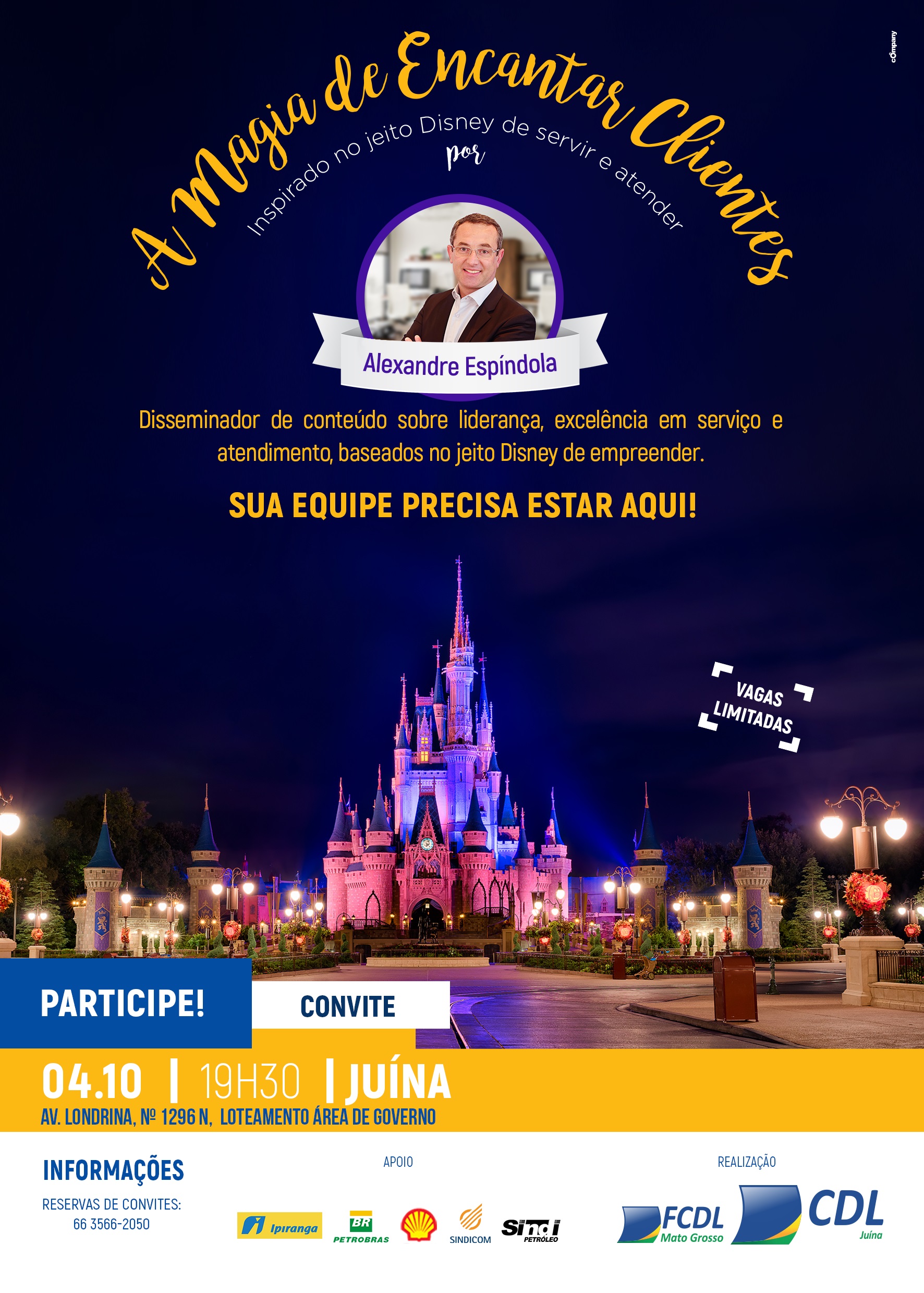 Precisando aumentar suas vendas, motivar sua equipe e garantir melhores resultados em tempos difíceis? A fim de auxiliar os lojistas juinenses, a CDL/ASCOM trás um dos mais renomados palestrantes do país, Prof. Alexandre Espindola com a palestra “A Magia de encantar clientes inspirado no jeito DISNEY de servir e atender”.