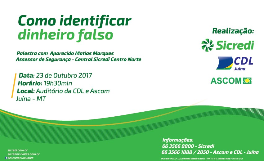 A fim de colaborar com comunidade, a Sicredi Univales estará trazendo a Juína o Aparecido Matias Marques, Assessor de Segurança - Central Sicredi Centro Norte, para uma palestra que acontece no dia 23 de Outubro, às 19h30min no auditório da CDL/ASCOM.