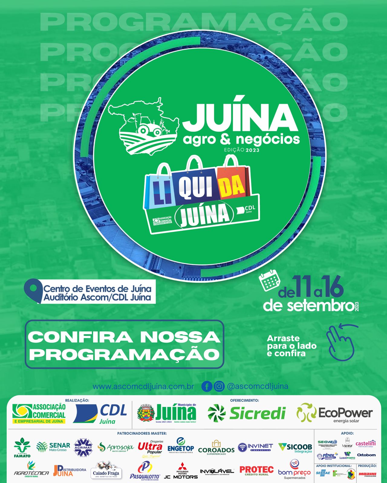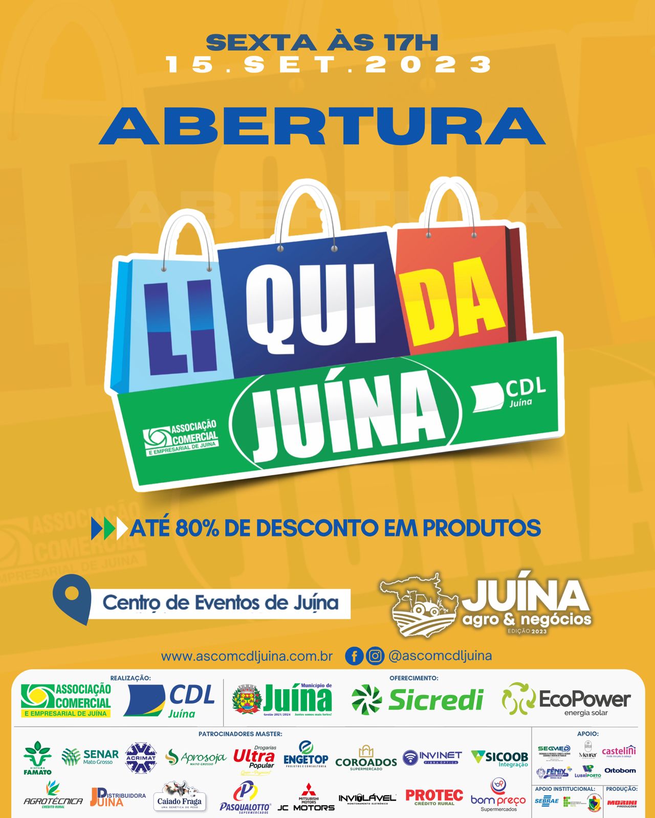 17:00h – Abertura do Liquida Juína 2023, sequência do Juína Agro e Negócios e Feira Gastronômica.