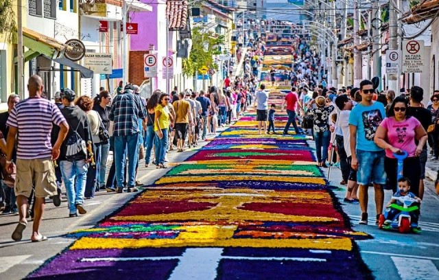 Em várias cidades brasileiras, fieis seguem uma tradição portuguesa de confecção de grandes tapetes em espaços públicos. Os painéis são feitos de serragem, sal ou outros materiais coloridos que formam desenhos com referências bíblicas. Os encontros costumam começar na noite anterior e terminam no dia de Corpus Christi com a celebração da comunhão em grandes missas.