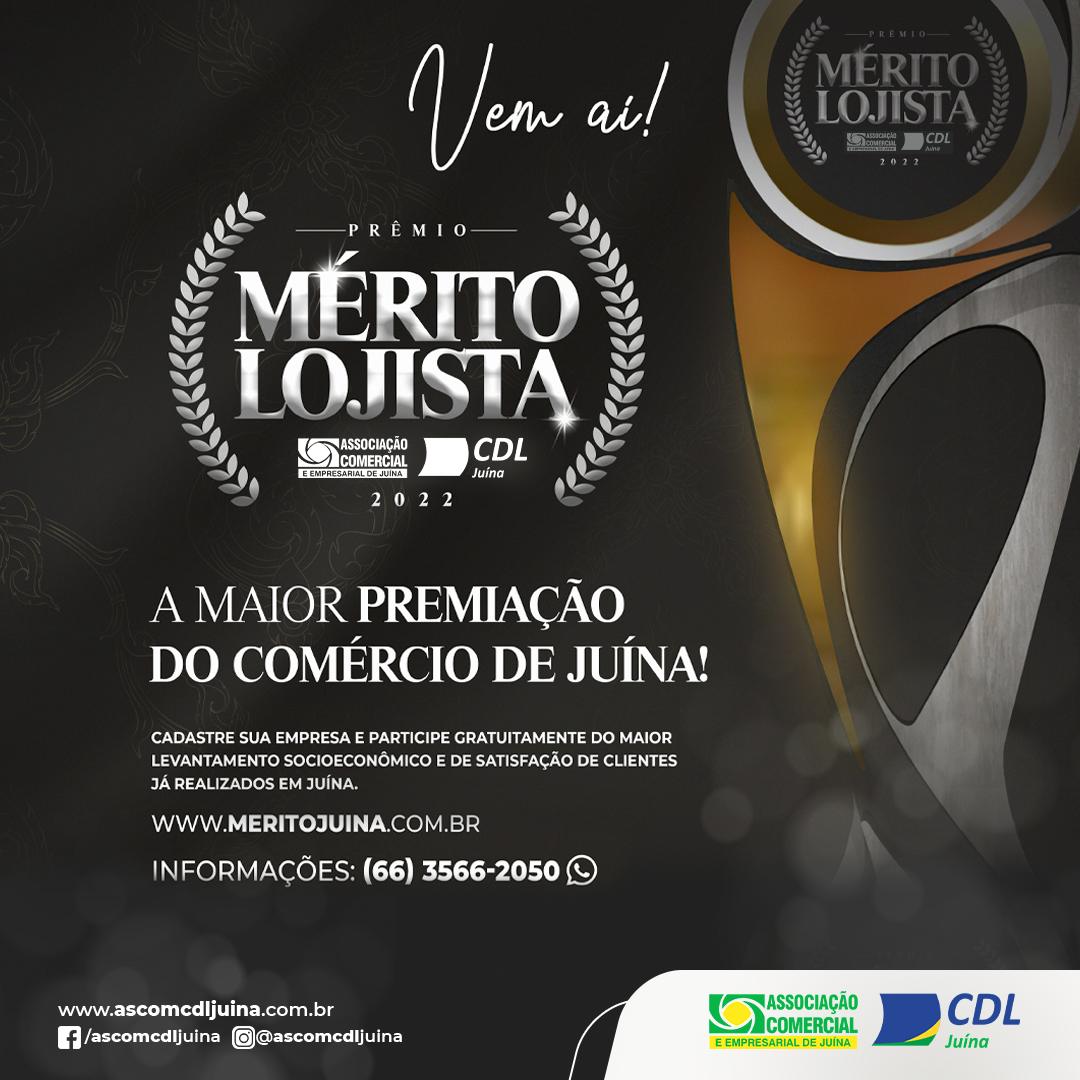 Iniciou no dia 02 de janeiro, o período o período para as empresas de Juína se cadastrarem no “Mérito Juína”, realizado pela Ascom/CDL. O Cadastro se dará exclusivamente via online, através do site oficial do prêmio: www.meritojuina.com.br. Qualquer empresa pode ser cadastrada por seus proprietários (as) ou representantes. O período de cadastro se encerra no dia 31/01/2023.