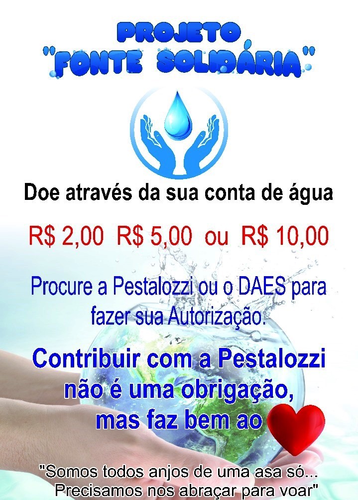 A Lei 1.763 de 2017 permite que você doe para Pestalozzi uma quantia mensal, através da sua conta de água, os valores são de R$ 2,00 R$ 5,00 ou R$ 10,00, basta assinar a autorização que esta disponível na Pestalozzi no Daes e no dia 08 de dezembro, no dia “D”, haverá pontos de coleta na Praça da Bíblia e na Praça do Módulo 05, além das emissoras de rádios e TV´s que estarão dando apoio.
