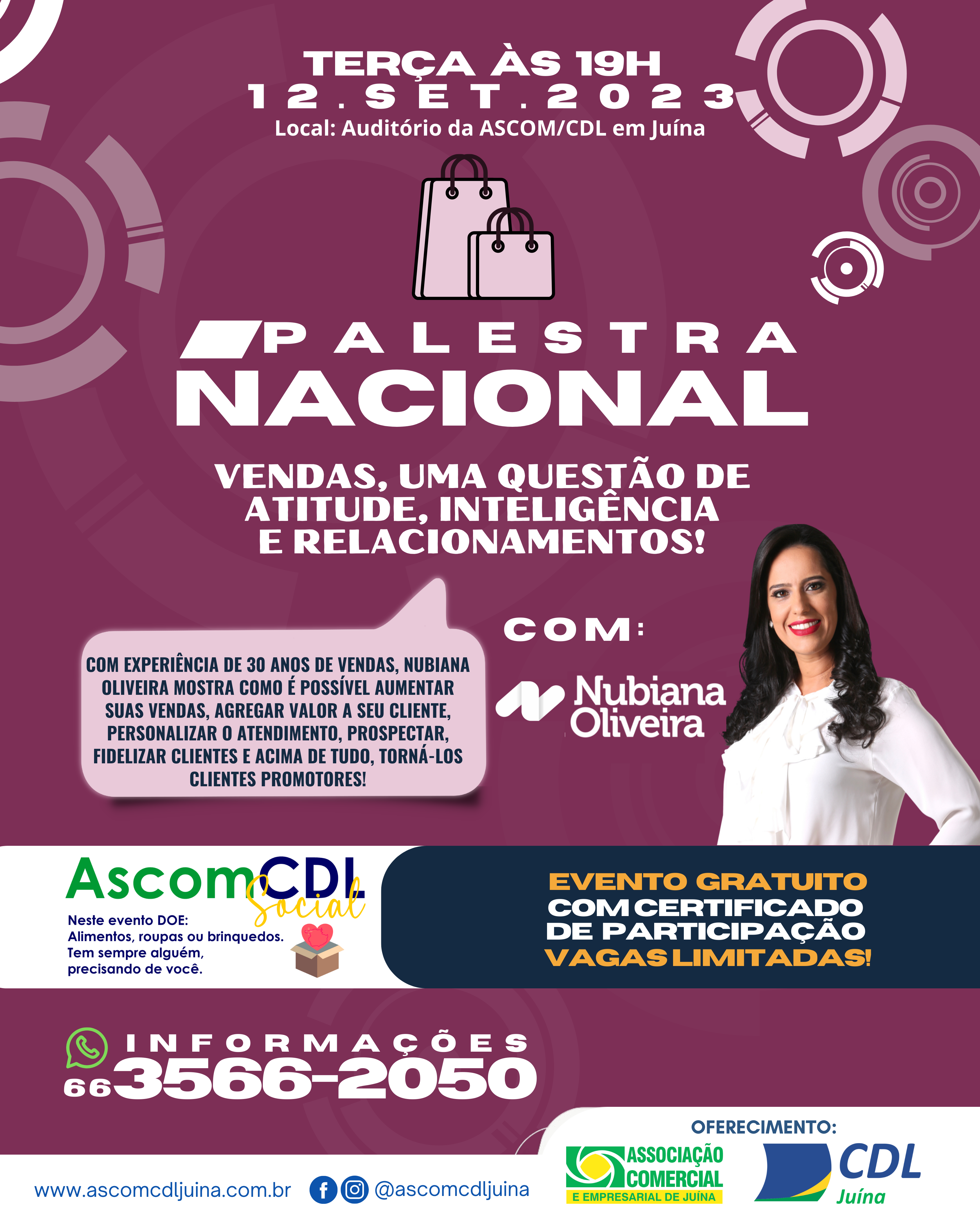 Terça 12/09: 19:00h – Palestra Nacional - Vendas, uma questão de atitude, inteligência e relacionamentos com Nubiana Oliveira. Local: Auditório ASCOM/CDL Juína – Entrada franca, vagas limitadas (doe alimentos, roupas ou brinquedos). CLIQUE AQUI E INSCREVA-SE - VAGAS LIMITADAS