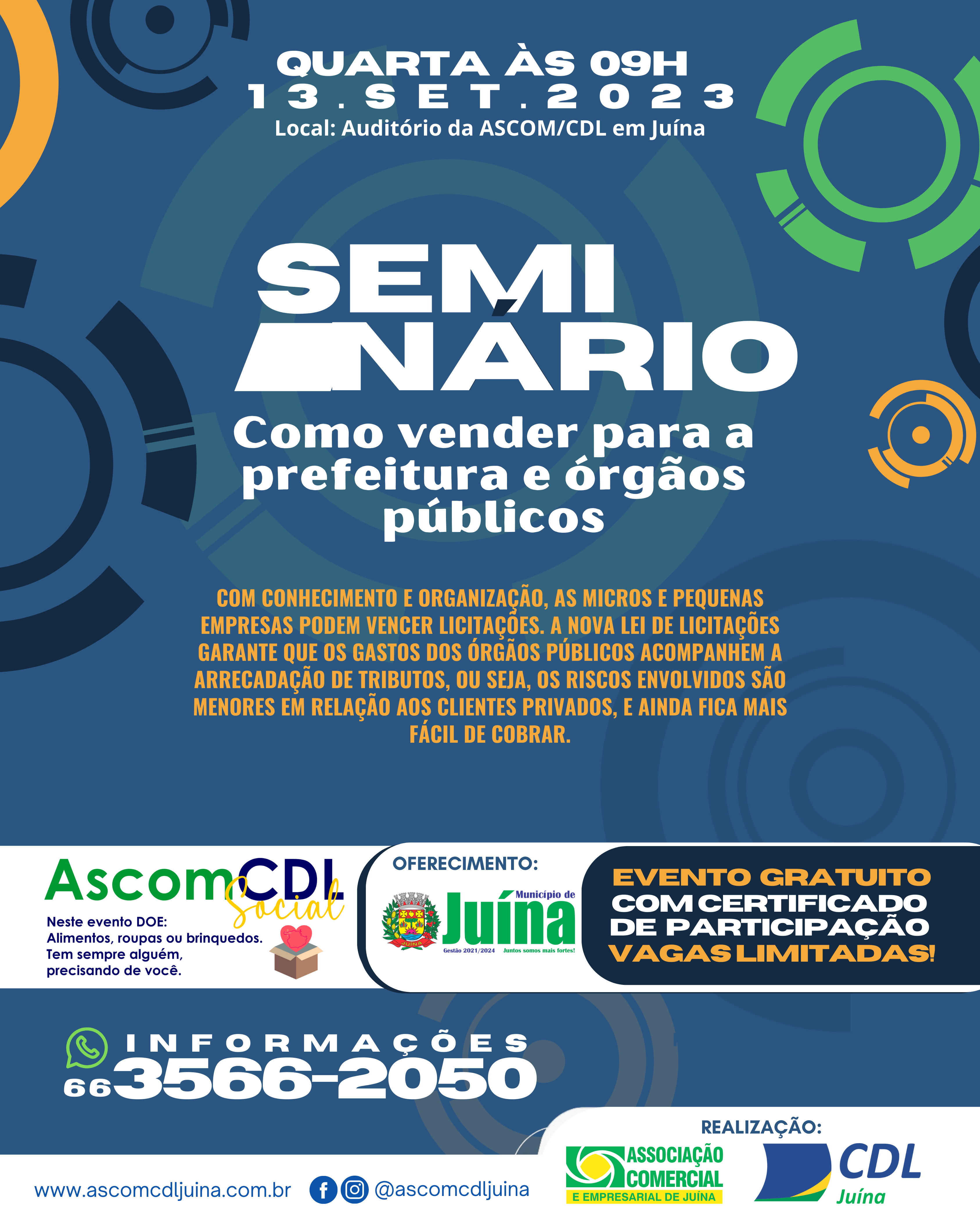 Quarta 13/09: 09:00h - Seminário - Como vender para a prefeitura e órgãos públicos. Oferecimento: Prefeitura de Juína. Com conhecimento e organização as micros e pequenas empresas podem vencer licitações. A nova Lei de licitações garante que os gastos dos órgãos públicos acompanhem a arrecadação de tributos ou seja, os riscos envolvidos são menores em relação aos clientes privados, e ainda fica mais fácil de cobrar. Local: Auditório ASCOM/CDL Juína. Entrada franca, vagas limitadas (doe alimentos, roupas ou brinquedos). CLIQUE AQUI E INSCREVA-SE - VAGAS LIMITADAS