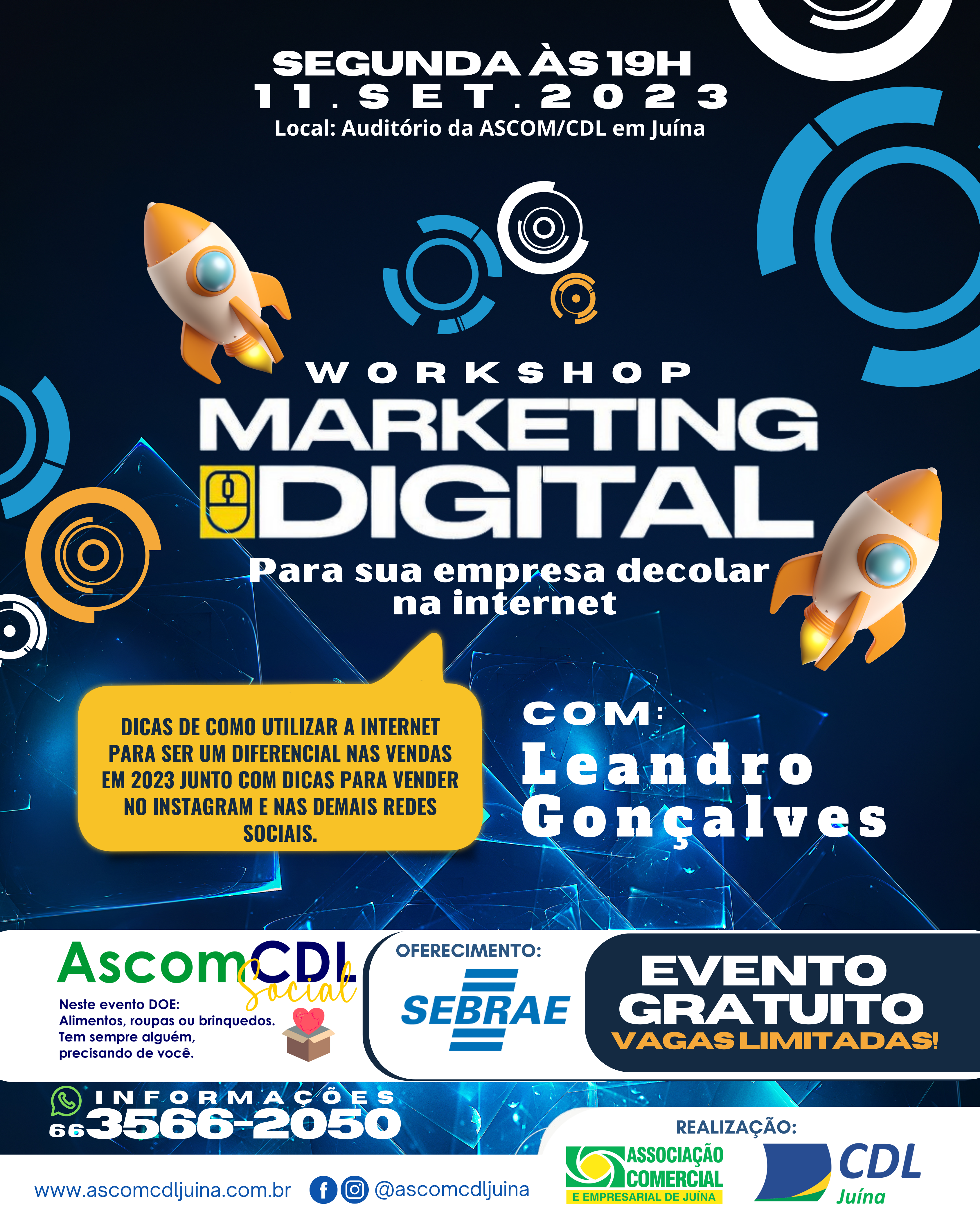 Segunda 11/09: 19h00 - Workshop - Marketing digital para sua empresa decolar na Internet com Leandro Gonçalves. Local: Auditório ASCOM/CDL Juína – Entrada franca, vagas limitadas (doe alimentos, roupas ou brinquedos). CLIQUE AQUI E INSCREVA-SE - VAGAS LIMITADAS