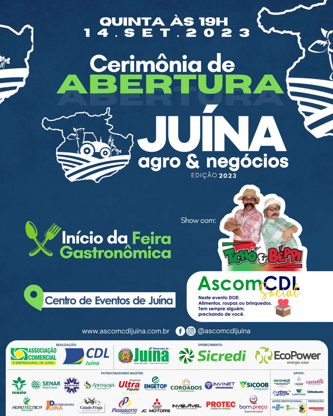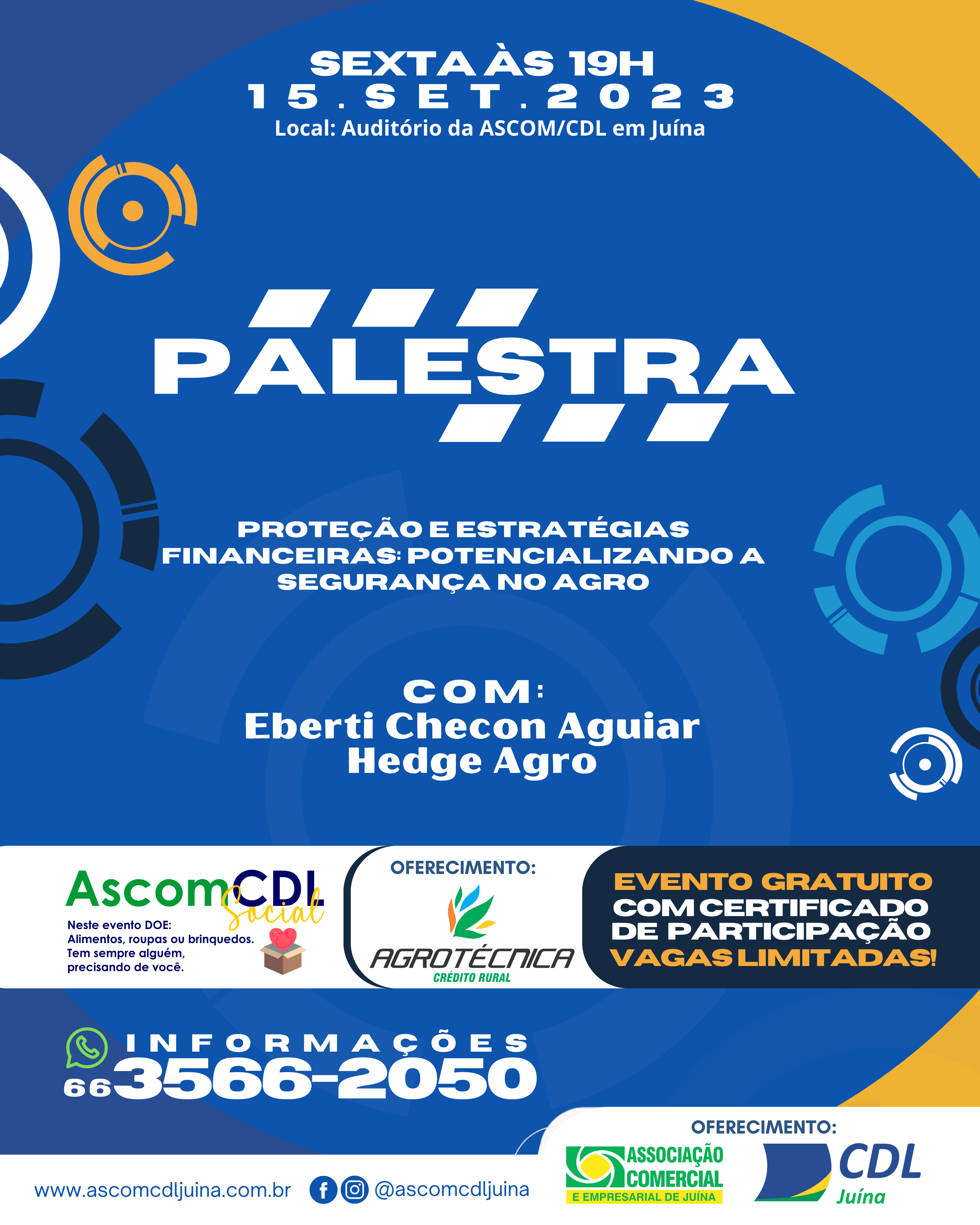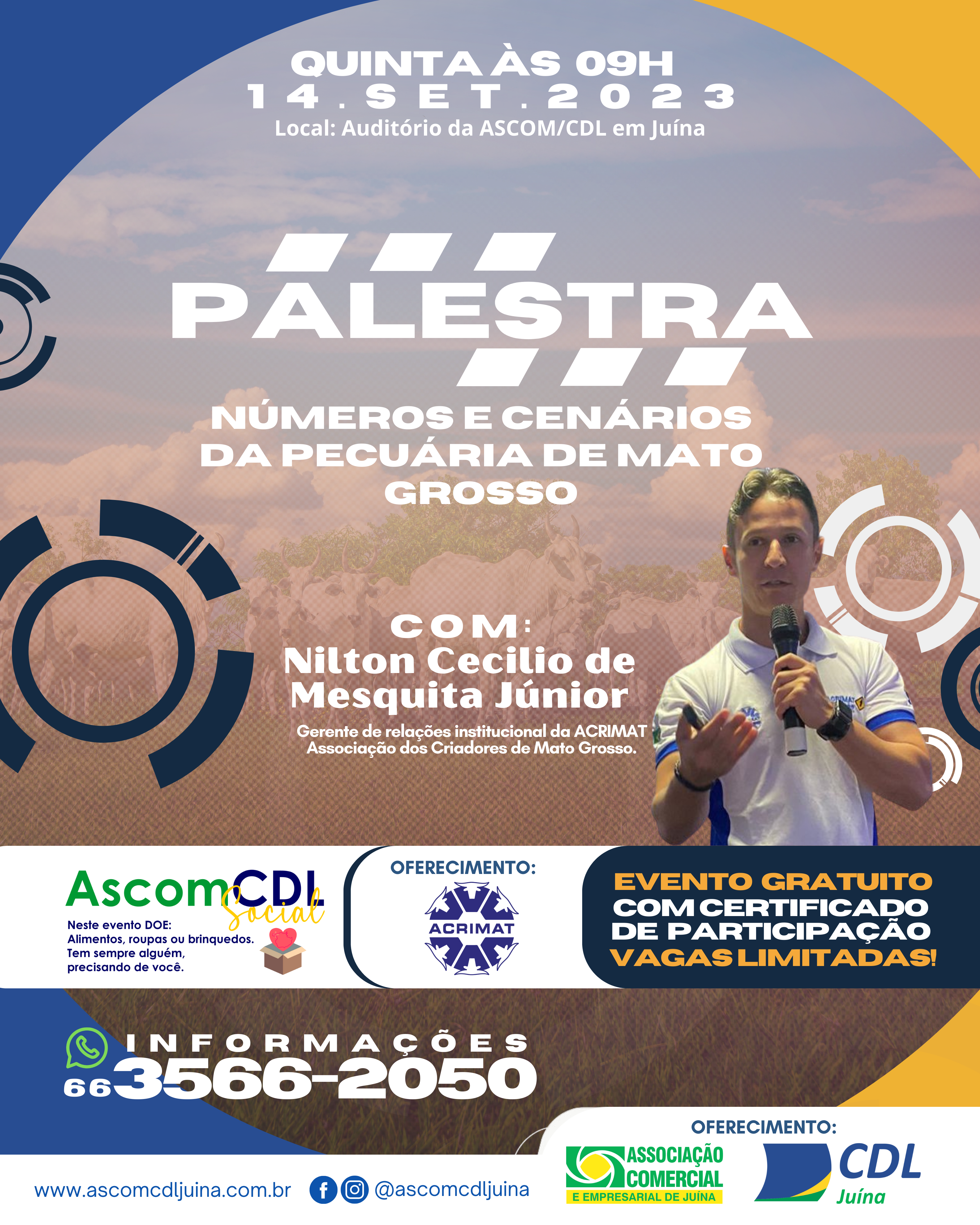 Quinta 14/09: 09:30h – Palestra - Números e cenários da pecuária de MT com Nilton Cecilio de Mesquita Júnior, Gerente de Relações Institucionais na Acrimat– Associação dos Criadores de Mato Grosso. Local: Auditório ASCOM/CDL Juína – Entrada franca, vagas limitadas (doe alimentos, roupas ou brinquedos).