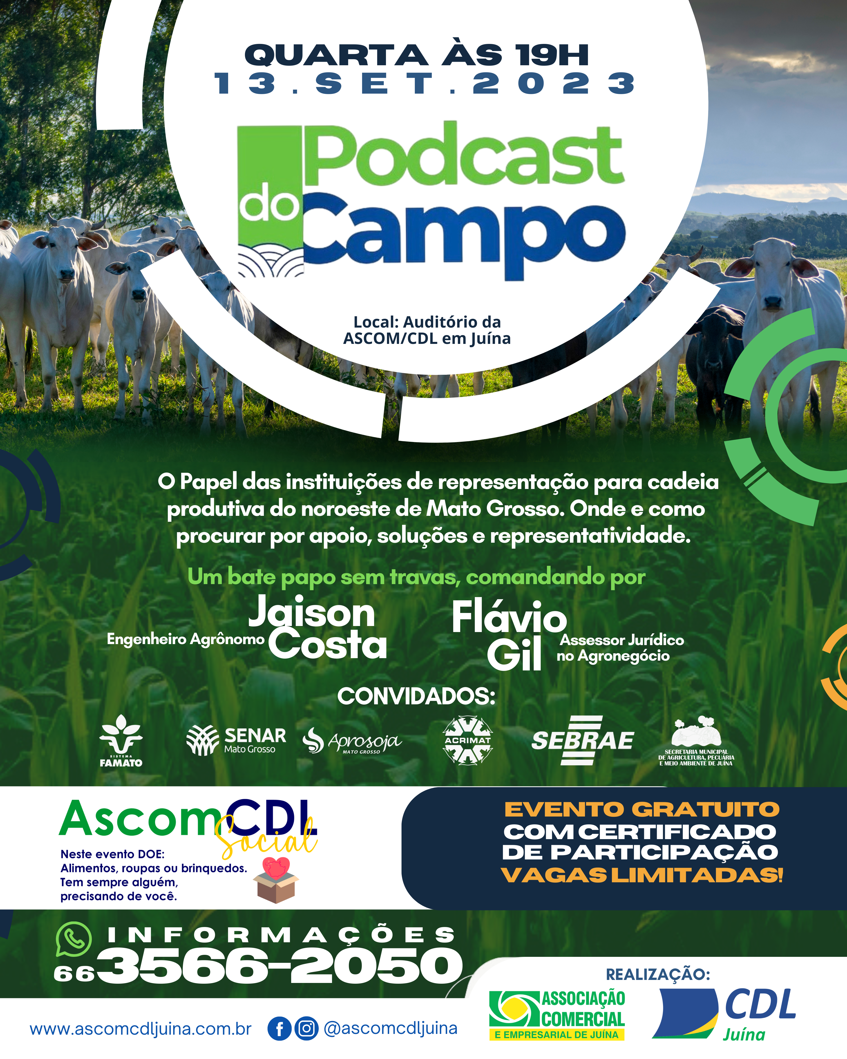 Quarta 13/09: 19h00h - PodCast do Campo - O papel das instituições de representação para cadeia produtiva do noroeste de Mato Grosso. Onde e como procurar por apoio, soluções e representatividade. Convidados: ACRIMAT – APROSOJA – SEBRAE – SAMMA. CLIQUE AQUI E INSCREVA-SE - VAGAS LIMITADAS